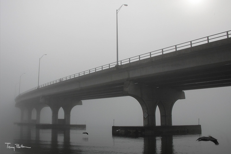 Pelicans in the Fog at the Vilana Bridge